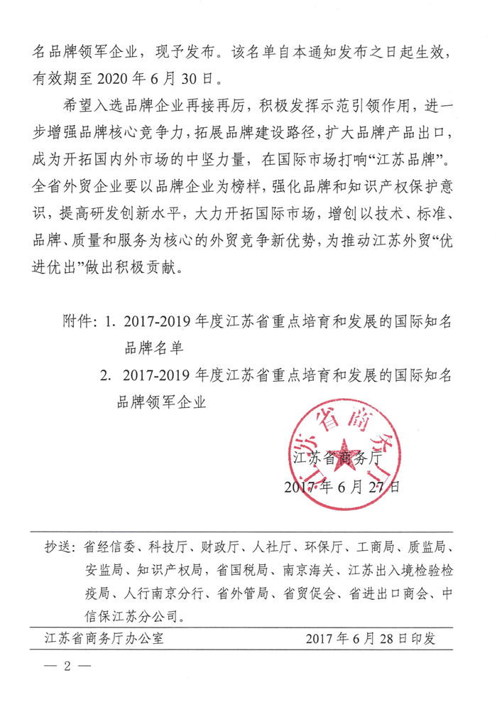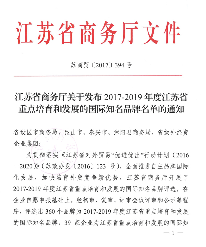 近日,省商務廳公布“2017-2019年度江蘇省重點培育和發(fā)展的國際知名品牌”名單,經(jīng)過層層評比,江蘇鵬飛集團榮膺在列。