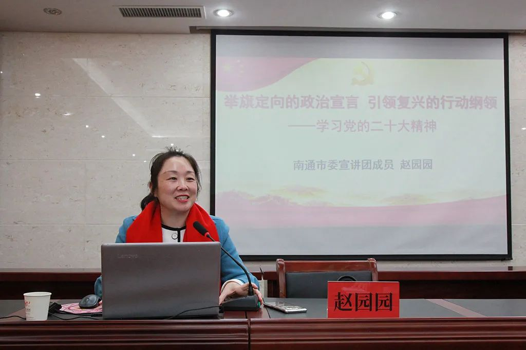 近日,深入推進(jìn)學(xué)習(xí)宣傳貫徹黨的二十大精神在鵬飛集團(tuán)蔚然成風(fēng),12月7日下午,南通市委宣講團(tuán)成員,南通市委黨校副校長、教授趙園園走進(jìn)鵬飛,來公司開展學(xué)習(xí)貫徹黨的二十大精神專題宣講,進(jìn)一步引導(dǎo)鵬飛人把思想和行動統(tǒng)一到黨的二十大精神上來。鵬飛集團(tuán)在新征程上用黨的創(chuàng)新理論武裝頭腦、指導(dǎo)實踐、推動工作,更好地“扛起新使命、譜寫新篇章”,以實際行動和過硬成果推動黨的二十大精神落地見效。大公鎮(zhèn)黨委書記金山存、黨委副書記閻超、宣傳委員徐譯,鵬飛集團(tuán)黨委書記、董事長王家安等認(rèn)真聽取了宣講內(nèi)容,經(jīng)發(fā)局全體人員、鵬飛集團(tuán)全體負(fù)責(zé)人、工人代表等參加專題學(xué)習(xí)。