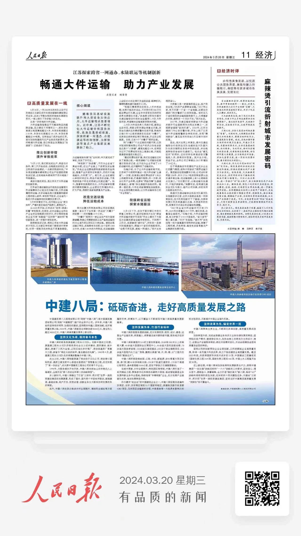 隨著我國基礎(chǔ)設(shè)施提升和大型設(shè)備加快應(yīng)用,大件運輸需求顯著增加。近年來,江蘇不斷優(yōu)化大件運輸審批服務(wù)流程,改造交通基礎(chǔ)設(shè)施,探索跨省一網(wǎng)通辦、水陸聯(lián)運等機制創(chuàng)新,為新能源等重點產(chǎn)業(yè)集群發(fā)展提供了助力。3月18日,一列200米長的車隊從位于江蘇南京江北新區(qū)的中車南京浦鎮(zhèn)車輛有限公司出發(fā),運送6節(jié)橙白相間的地鐵車廂駛往蘇州,一路上吸引了許多路人的目光。這是一次標準的大件運輸。大件運輸是指載運不可解體物品的超限運輸,至少滿足下列情形之一:其車貨總高度從地面算起超過4米、車貨總寬度超過2.55米、車貨總長度超過18.1米、車貨總質(zhì)量超過49噸等。在制造業(yè)門類齊全的江蘇,面對加快構(gòu)建現(xiàn)代化產(chǎn)業(yè)體系的新要求,如何暢通大件運輸、助力制造業(yè)發(fā)展跑出“加速度”?記者進行了走訪。推出創(chuàng)新舉措提升審批效率 “3月17日,我們剛完成生產(chǎn)、具備交付條件,第二天開始運送,當晚就運送到位,并立即進行設(shè)備調(diào)試,一點都沒耽誤時間。”中車南京浦鎮(zhèn)車輛有限公司生產(chǎn)經(jīng)理歐明根告訴記者,這批地鐵車廂將用于蘇州地鐵7號線建設(shè)?! 「咝拥谋澈?,是江蘇關(guān)于大件運輸?shù)膭?chuàng)新改革?! 〗K省交通運輸綜合行政執(zhí)法監(jiān)督局大件運輸事務(wù)辦公室主任馬梅介紹,大件運輸屬特種運輸,許多運輸品是大國重器和超級工程的核心部件,審批環(huán)節(jié)較多,過去省內(nèi)一般的大件運輸審批時間最快也要3天?! ?天時間看似不長,但可能讓企業(yè)“度日如年”,嚴重時甚至造成產(chǎn)線停工,影響生產(chǎn)?! ?023年開始,江蘇試點“信用+承諾+批量”審批服務(wù);在南京,還對運輸企業(yè)和生產(chǎn)企業(yè)的合規(guī)程度分別評分,評分等級較高的企業(yè)可享“免勘驗”“壓時限”“減材料”等創(chuàng)新服務(wù),進一步提升審批效率?! W明根告訴記者,得知公司有大件運輸?shù)挠媱澓?,江北新區(qū)審批部門提前進行預(yù)審批,對同一規(guī)格及批次物品不再重復(fù)勘驗,為運輸?shù)罔F車廂“搶”出時間,半天就完成了審批,發(fā)放了許可證?!?ldquo;審批按下‘快進鍵’,不僅為企業(yè)省下真金白銀,還讓產(chǎn)業(yè)鏈上下游更加安全穩(wěn)定。”風電企業(yè)遠景能源物流部聯(lián)絡(luò)員金煒說,隨著產(chǎn)業(yè)升級和功率提升,風機葉片越造越長,大件更“大”。前幾年,企業(yè)還曾擔心審批時間過長,物品不能及時運輸,于是考慮到客戶所在的西部山區(qū)就近建廠。如今,隨著審批流程的優(yōu)化,大件運輸審批慢的問題得到解決,企業(yè)便在江蘇增加布點、擴大產(chǎn)能,持續(xù)打造新能源重點產(chǎn)業(yè)鏈。 改造交通設(shè)施 降低運輸成本 常州臺廈大件物流有限公司總經(jīng)理武海青一直忘不了去年第一次運送“大罐子”的場景——歷時整整15個小時?!?ldquo;大罐子”是常州一家企業(yè)生產(chǎn)的大型液氮儲罐,物流公司需要將其從生產(chǎn)基地運輸?shù)郊s35公里外的江陰長江口岸出海。接到這筆運輸訂單后,武海青有點犯愁:這個容積1000立方米、總高7.05米的大件物品,在運輸?shù)缆飞蠒?jīng)過65處紅綠燈及監(jiān)控設(shè)備、路牌標識,障礙物最低通行高度僅5.5米?!?ldquo;輪船已靠港停泊在碼頭,5天內(nèi)將啟程,如果不能及時運出,不僅預(yù)付的300萬元船運費會打水漂,企業(yè)辛辛苦苦攻關(guān)的研發(fā)成果也要砸在手里。”武海青立即向無錫市交通運輸綜合行政執(zhí)法監(jiān)督局二大隊大件組求助,希望解決運輸高度受限的問題?! 《箨牬蠹M負責人馮虎介紹,接到企業(yè)訴求后,局里立即協(xié)調(diào)會商拿出方案,決定由交通執(zhí)法車輛或警車在前開道,物流車以每小時5公里的速度在后運送“大罐子”,在其到達前拆卸紅綠燈等設(shè)施,開過后立即復(fù)原。目前,已有9個“大罐子”順利出海?! 『?ldquo;大罐子”個頭過高的問題不同,江陰市恒潤環(huán)鍛有限公司生產(chǎn)的風力發(fā)電設(shè)備法蘭是個“小胖墩”,最寬處超過5米,經(jīng)常因為過不了收費站而無法上高速公路,只能經(jīng)普通國省道或水路過江?!?ldquo;最近收費站改擴建,我們在運輸法蘭時走了高速公路,一路很通暢!”公司副總經(jīng)理潘云剛告訴記者,這不但為企業(yè)節(jié)省了1/5的運輸時間,還大幅降低了運輸成本?! ●R梅介紹,為了讓大件運輸有路可走,江蘇將于今明兩年建設(shè)一批大件運輸“主通道”:一方面,在高速公路收費站改擴5米以上的超寬車道,打通通行瓶頸;另一方面,結(jié)合江蘇產(chǎn)業(yè)布局,在原有“兩縱四橫”主通道的基礎(chǔ)上,新增7條主通道并連線成網(wǎng)。值得一提的是,今年還將新增智能選線服務(wù),為企業(yè)規(guī)劃最優(yōu)路線,讓大件運輸有自己的“專業(yè)導(dǎo)航”?! °暯涌缡∵\輸 探索水陸聯(lián)運 3月5日下午,在位于泰州靖江市的大明重工有限公司,副總經(jīng)理吳興生在“跨省大件運輸并聯(lián)許可系統(tǒng)”平臺上提交了大型壓力容器的跨省運輸申報資料。不到兩個工作日,他就拿到“通行證”,并收到一條泰州到福建福州、跨越3個省份的線路規(guī)劃。“全程不用見面,就