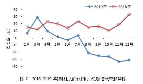 2019年,建材機(jī)械行業(yè)累計實現(xiàn)利潤總額36.57億元,同比下降31.00%,增速較上年同期回落64.26個百分點,落后于建材工業(yè)(15.6%)、機(jī)械工業(yè)(-4.53%)的增速,遠(yuǎn)低于建材機(jī)械相關(guān)領(lǐng)域工程機(jī)械(16.48%)、重型礦山機(jī)械(21.65%)增速。從增速變化趨勢看(見圖2),全年利潤總額增速下行態(tài)勢明顯,且與上年相比回落較大,降幅最高達(dá)64.26個百分點。