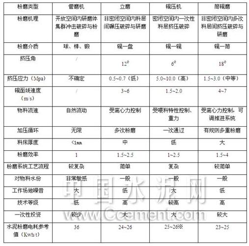 表1   管磨機(jī)與立磨、輥壓機(jī)、筒輥磨粉磨特性對(duì)比