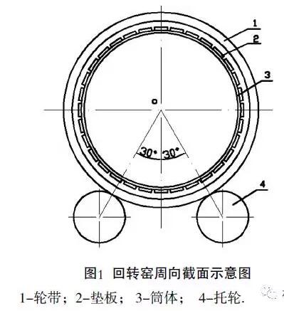 為解決回轉(zhuǎn)窯壓條頻繁掉落的故障,必須恢復(fù)輪帶內(nèi)表面與墊板外表面之間的間隙,使回轉(zhuǎn)窯在運(yùn)轉(zhuǎn)過程中輪帶剛好箍在筒體墊板上,降低墊板與輪帶的磨損,如直接更換輪帶與原墊板,不僅維修費(fèi)用高,而且工程量大。公司采取增加墊板的厚度和使用輪帶專用耐高溫固體潤滑劑以予解決。