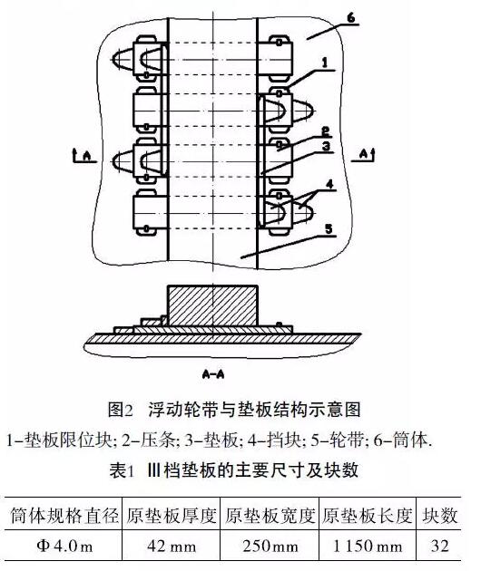 我公司生產(chǎn)的回轉(zhuǎn)窯采用浮動(dòng)輪帶支撐窯筒體,輪帶是實(shí)心矩形斷面活套套在筒體上,加固窯筒體,見圖1。輪帶與筒體之間均勻分布著32塊墊板,避免輪帶內(nèi)表面與筒體外表面直接接觸。圖2為浮動(dòng)輪帶與墊板結(jié)構(gòu)示意圖。表1為Ⅲ檔原墊板 的主要尺寸及塊數(shù)。在回轉(zhuǎn)窯運(yùn)轉(zhuǎn)過程中,筒體、輪帶和墊板之間留有一定的間隙。表2為輪帶內(nèi)徑與墊板外徑之間的間隙,這樣必然引起輪帶與筒體墊板之間產(chǎn)生滾動(dòng)和滑移。我公司生產(chǎn)的回轉(zhuǎn)窯已運(yùn)轉(zhuǎn)僅年,墊板與輪帶內(nèi)圈均有不同程度的磨損,使輪帶起不到加固筒體作用,造成筒體橫截面變形增大,同時(shí)輪帶和墊板之間產(chǎn)生很大滑移,已超過極限值,致使限制輪帶軸向竄動(dòng)的壓條頻繁被推掉。